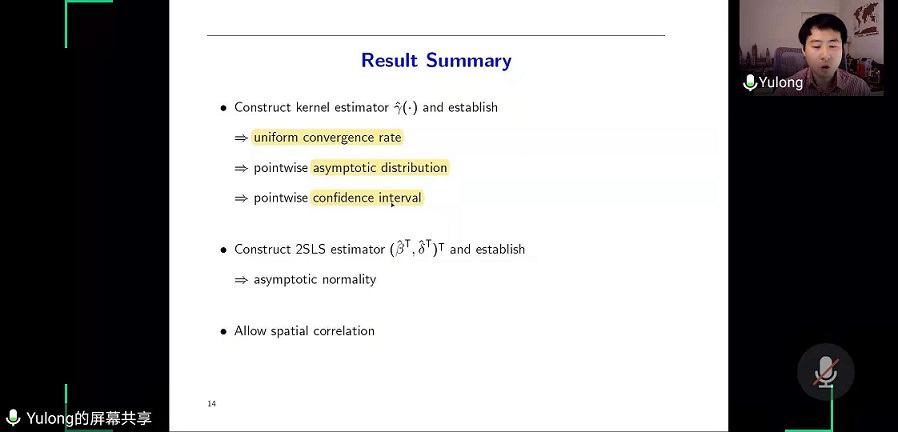 本次工作坊邀请到雪城大学助理教授王宇龙以“非参样本分割下的阈值回归”为题,为两院师生作了学术报告。工作坊由英国威廉希尔公司官网王熙助理教授主持。国家发展研究院沈燕教授、黄卓副教授、张俊妮副教授、孙振庭助理教授,英国威廉希尔公司官网王法副教授、刘蕴霆助理教授参与了工作坊。