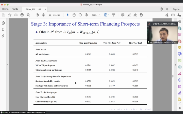 目前,三分之一的早期风险投资流向了由商业加速器支持的初创公司。陈川指出,该研究旨在理解初创公司加入加速器的初衷——是以缓解融资限制为主或以改善人力资本以实现长期增长。他进一步使用了一种新颖的三阶段双边匹配计量经济学框架,从数量上比较了在初创公司申请加速器过程中短期融资前景和长期增长前景对于是否加入加速器的影响。研究发现短期融资前景可以解释匹配值变化的48%,而关键五年创业业绩前景的变化可以解释96%。