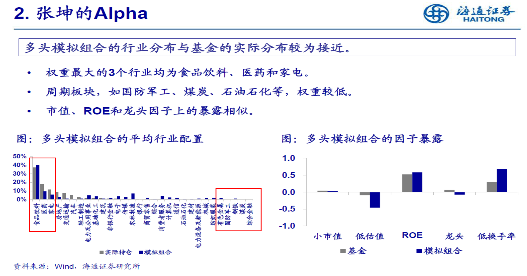 接着,基于Buffett’s Alpha的组合方法,模拟构建了张坤等明星基金经理的投资组合,发现模拟组合业绩表现优异,与基金实际行业分布较为接近。