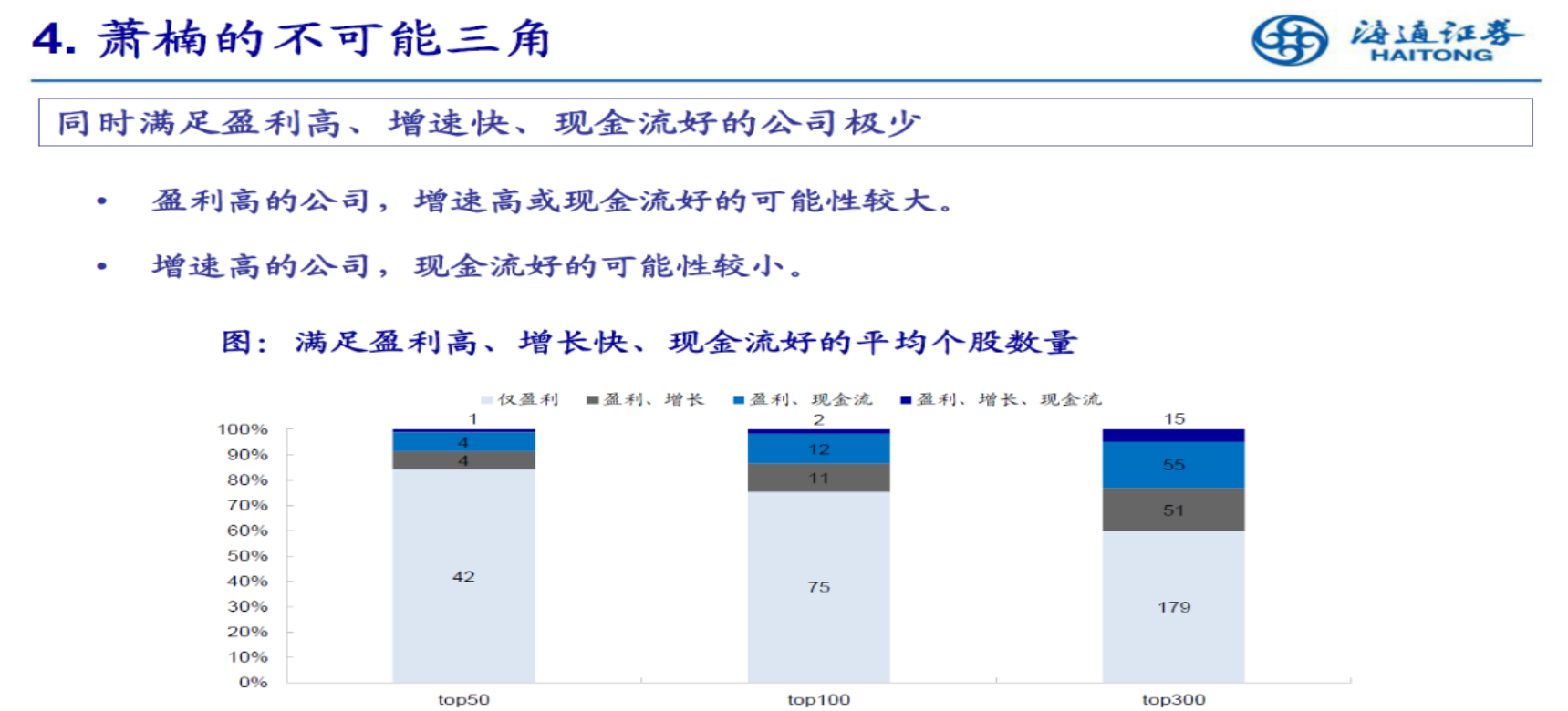 冯佳睿进一步介绍了“萧楠不可能三角”,即同时满足盈利高、增速快、现金流好的公司极少。这三者的截面相关性较低,同时兼具的股票虽然稀缺,但是历史表现突出。