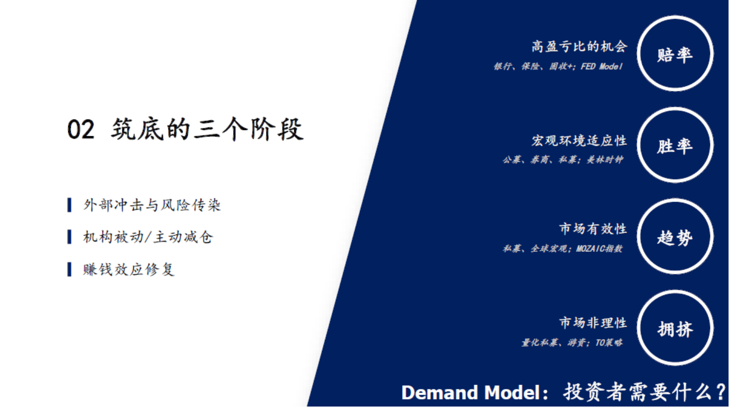 接着,林志朋先生从资产交易维度入手,讲述资产筑底的三个阶段。第一阶段是外部冲击与风险传染,重点观察VIX指数;第二阶段是机构被动/主动减仓,重点观察权益基金仓位、银行理财破净占比;第三阶段是赚钱效应提升、外资流入,重点观察筹码收益率和中国CDS指数。