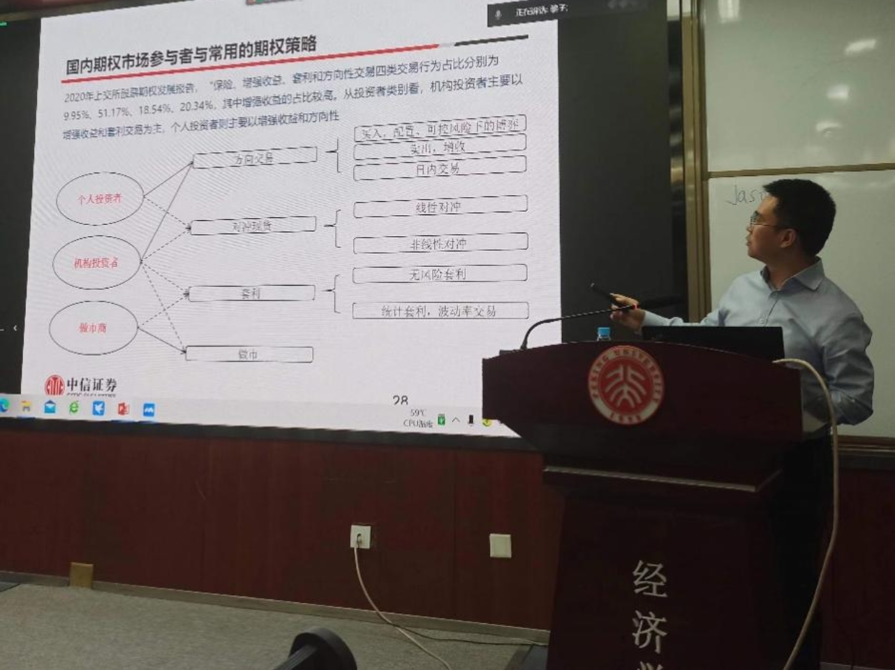 讲座开始前,北大金融工程实验室黎新平老师介绍了本次讲座的主题并热情欢迎了主讲嘉宾蔡成苗先生。蔡成苗先生首先介绍了自己在做市业务和期权交易领域的从业经历,并从做市品种及市场规模、做市业务介绍及期权交易策略三个方面进行了深入的分析。