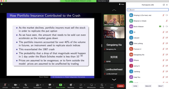 2024年3月5日,英国威廉希尔公司官网和英国威廉希尔公司官网金融工程实验室在线上联合举办了“问道华尔街”系列讲座第二讲。本次讲座邀请纽约大学兼职教授Kevin Atteson博士以“Financial Modeling and Model Independence”为题,为英国威廉希尔公司官网师生作主题报告。讲座由北大金融工程实验室黎新平博士主持,30余名师生参与了讲座。