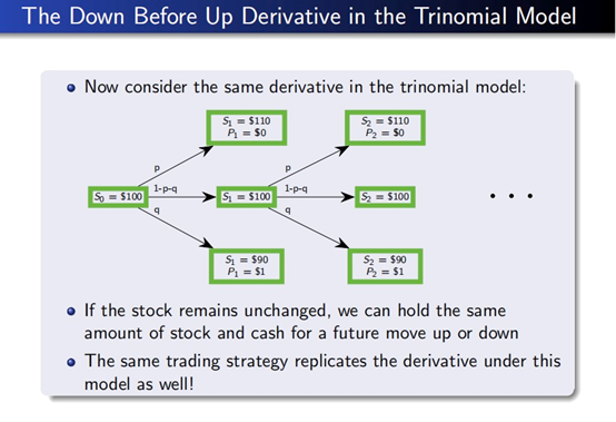 Atteson博士分析了基于期权定价模型并通过期权动态复制进行对冲管理所存在的问题。他进一步指出,如果改变模型的某些假设,如在二叉树中增加股价不变的状态演化为三叉树模型,那么期权并不能通过树状模型进行完全动态复制。然而Atteson博士提出,假如存在类似于先跌后涨(Down Before Up Derivative)的衍生品,则其价格在所有模型中都能够以相同策略进行复制。