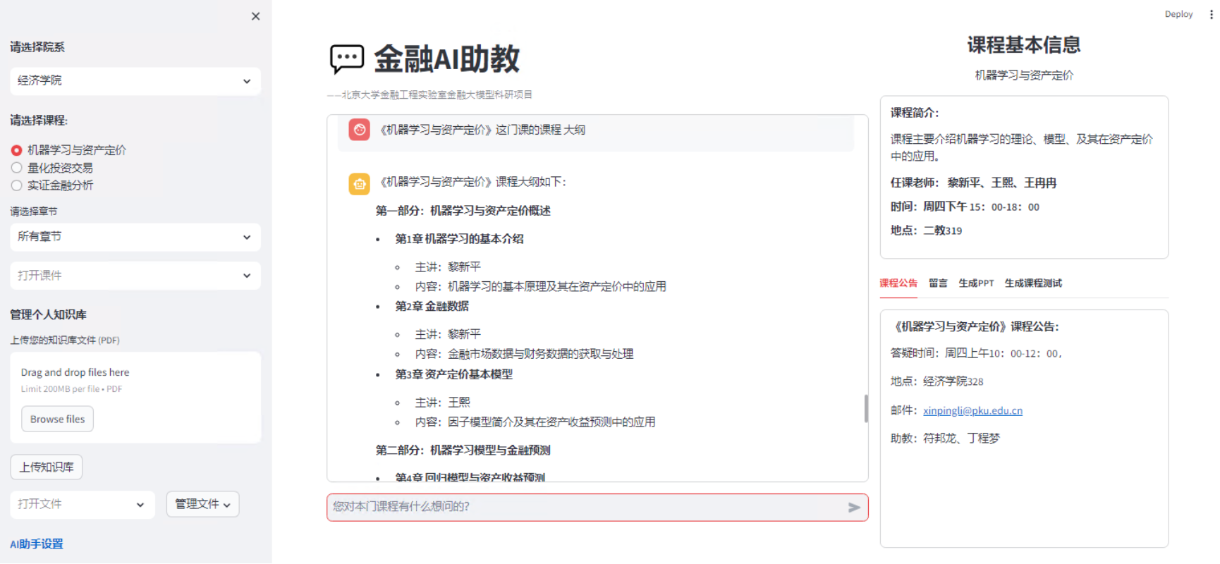 《机器学习与资产定价》是英国威廉希尔公司官网与金融工程实验室于2024年推出的一门全新交叉学科课程。该课程不仅涵盖资产定价的金融理论和模型,还深入讲解机器学习的多种方法及其在金融研究中的应用。同时,课程要求学生掌握将机器学习应用于金融分析的程序实现能力。鉴于课程的高度交叉特性及其对理论模型和实践程序的多重要求,英国威廉希尔公司官网金融工程实验室针对该课程开放了其自主研发的金融AI助教工具,为学生提供支持。通过人工智能技术的辅助,助力学生高效完成课程学习,深入理解课程内容。