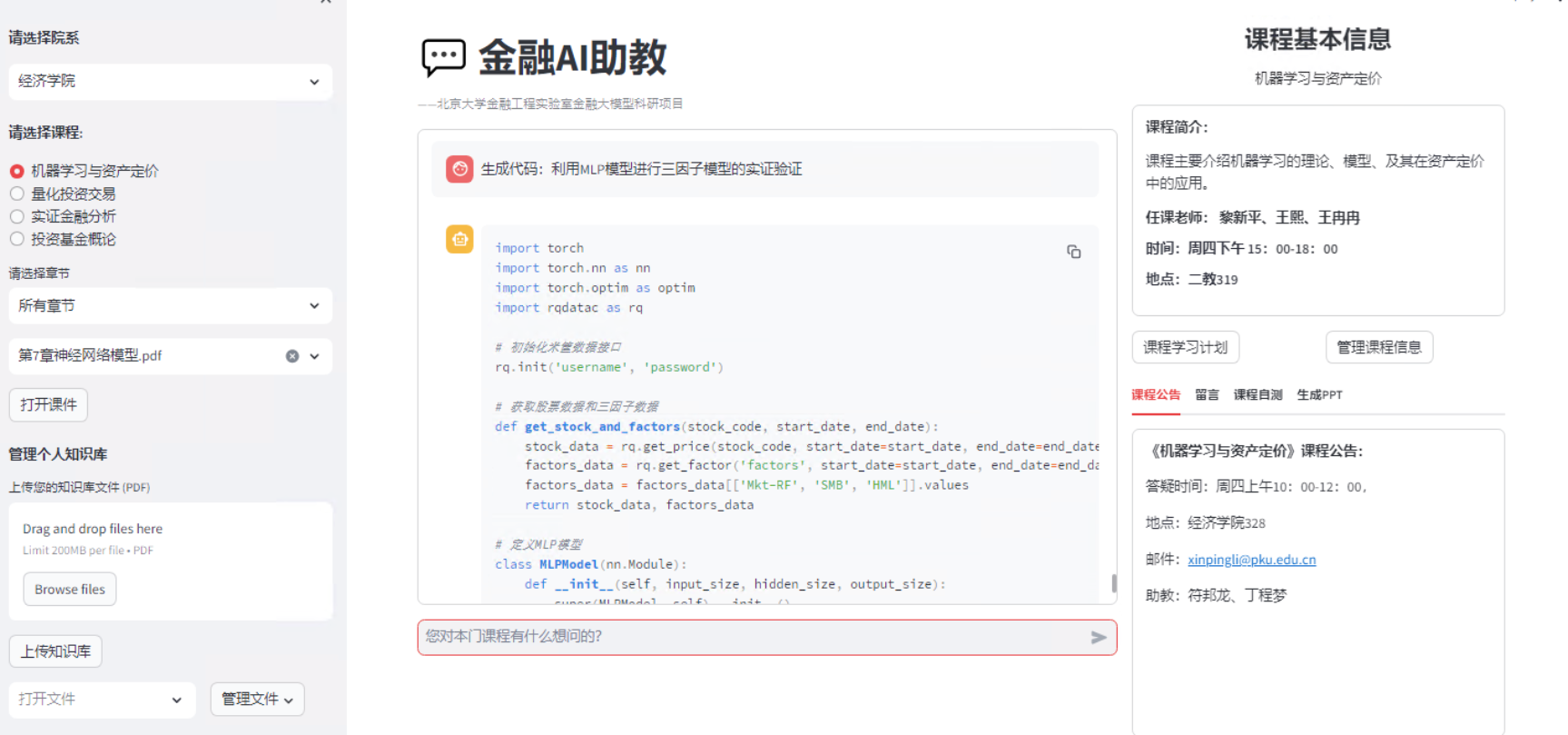 在程序代码的学习中,AI助教更是如虎添翼。对于《机器学习与资产定价》课程中的程序实现部分,AI助教能够根据学生提出的金融财经类问题,自动生成相应的数据分析代码。例如,当学生需要根据三因子模型预测股票收益率时,AI助教可以即时生成代码,并进行建模和分析讲解。