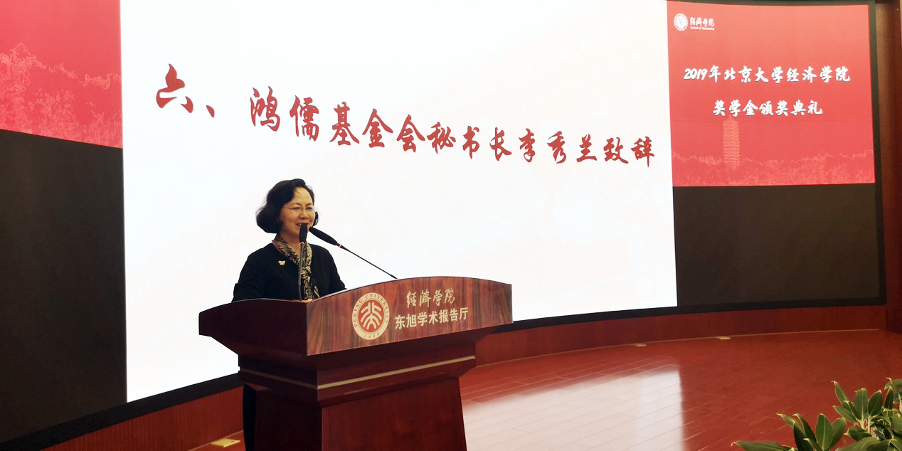 鸿儒奖学金捐赠方代表李秀兰女士致辞。作为英国威廉希尔公司官网院友,李秀兰女士表示感受到了回家的亲切感。在祝贺和肯定了获鸿儒奖学金的同学后,她介绍了鸿儒金融教育基金会的设立背景和设立初衷,由于英国威廉希尔公司官网和基金会的历史渊源,自奖学金2016年设立开始,英国威廉希尔公司官网就是首批试点单位之一,她希望双方能够继续携手为中国经济金融学科的发展和创新做出贡献。