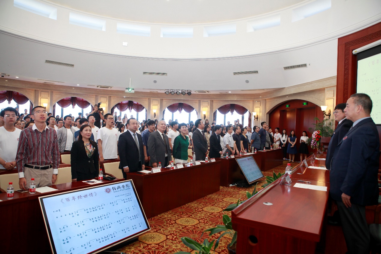 接下来进行的是院级奖助学金颁奖与新生代表佩戴校徽仪式。仪式过后,全体起立高唱《百年经世情》,典礼随之落下帷幕。