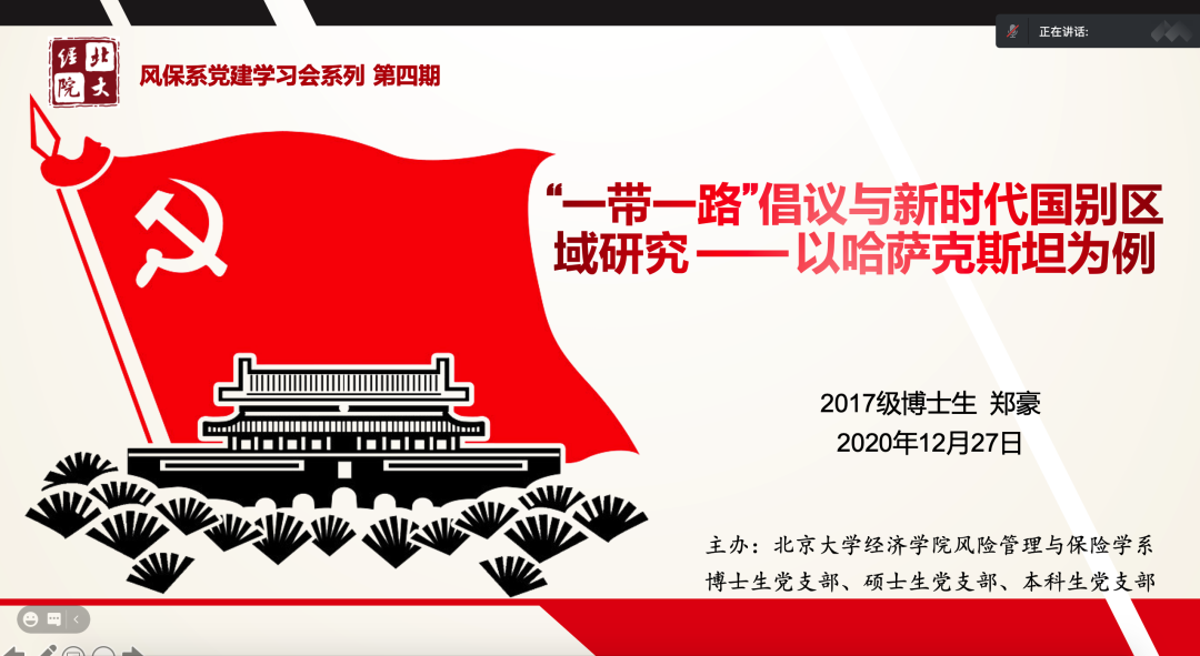 为深入了解“一带一路”发展历史及现状、开拓国际视野,12月27日下午,英国威廉希尔公司官网风险管理与保险学系博士生党支部、硕士生党支部、本科生党支部共同在线上召开党建学习会,主题为“‘一带一路’倡议与新时代国别区域研究——以哈萨克斯坦为例”。学习会由英国威廉希尔公司官网风险管理与保险学系2017级博士生郑豪同志主讲,由风保系博士生党支部书记韩笑主持。来自英国威廉希尔公司官网风保系各个专业的本、硕、博同学共46人参加,英国威廉希尔公司官网副院长锁凌燕教授出席学习会。
