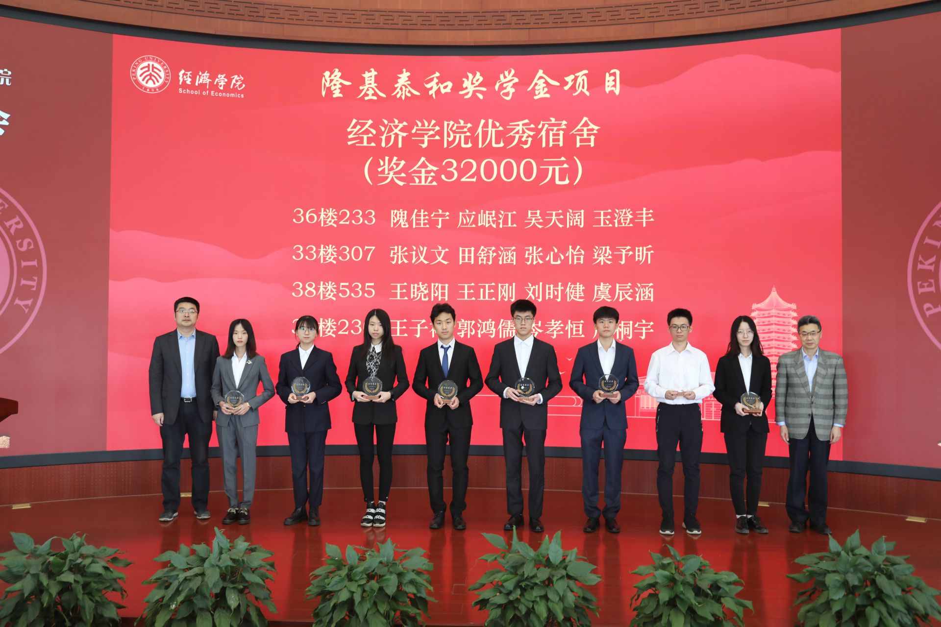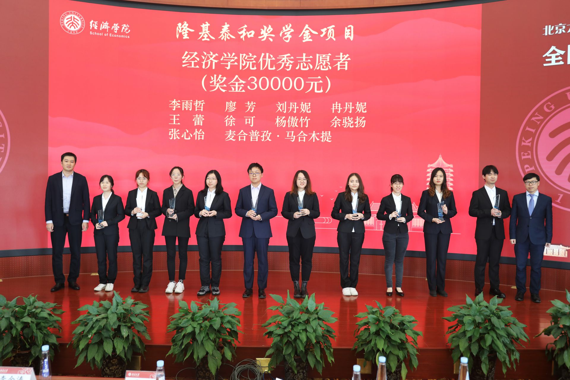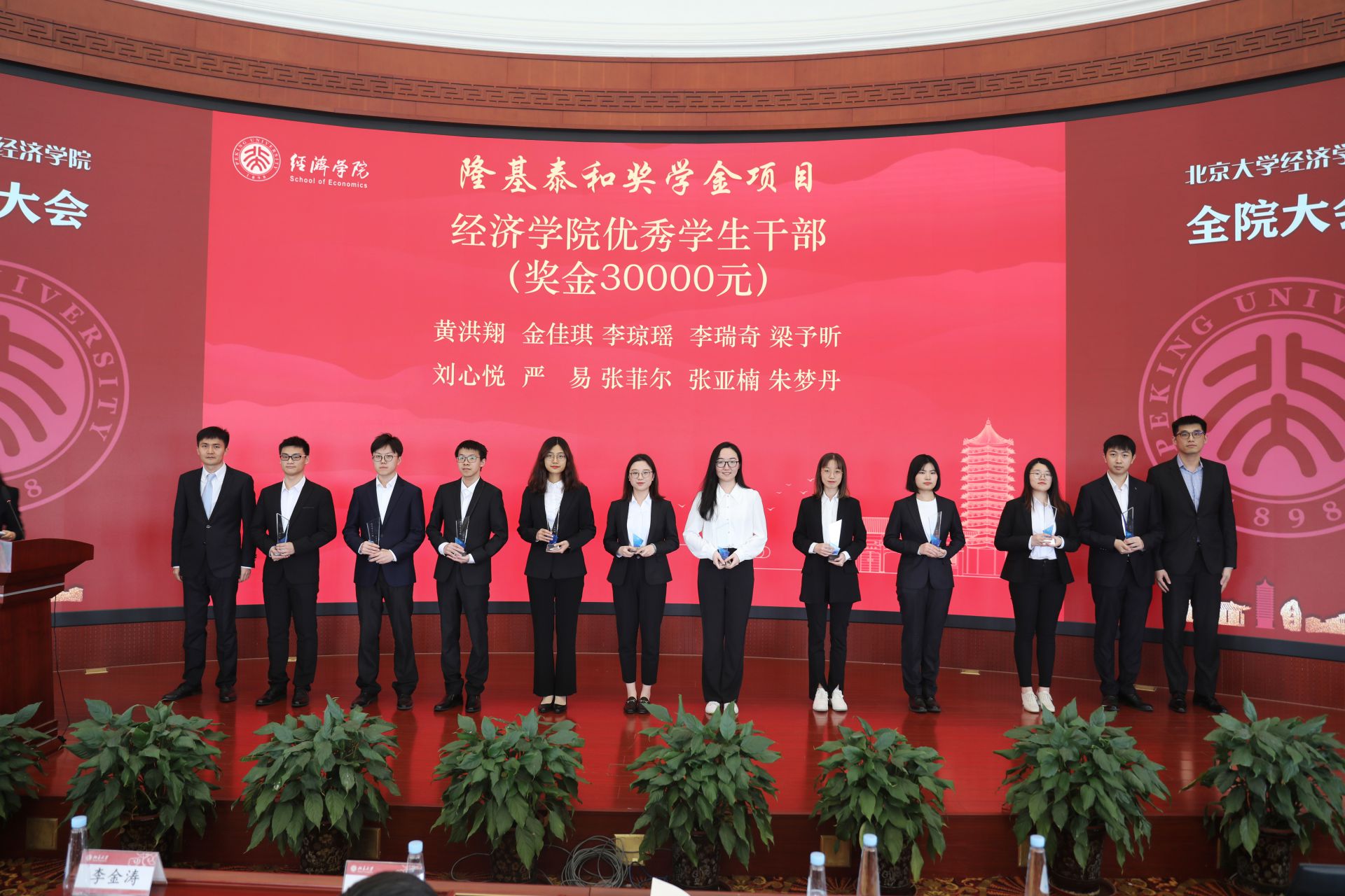 在颁奖环节中,荣获英国威廉希尔公司官网先进党支部、优秀班集体、优秀团支部、优秀宿舍、优秀党支书、优秀辅导员、优秀助教、优秀学生干部、优秀志愿者等奖励的学生代表及个人依次上台领奖,李金涛、王欣、崔建华、平新乔、孙祁祥、叶坦等捐赠方代表和教师代表为获奖者颁奖。