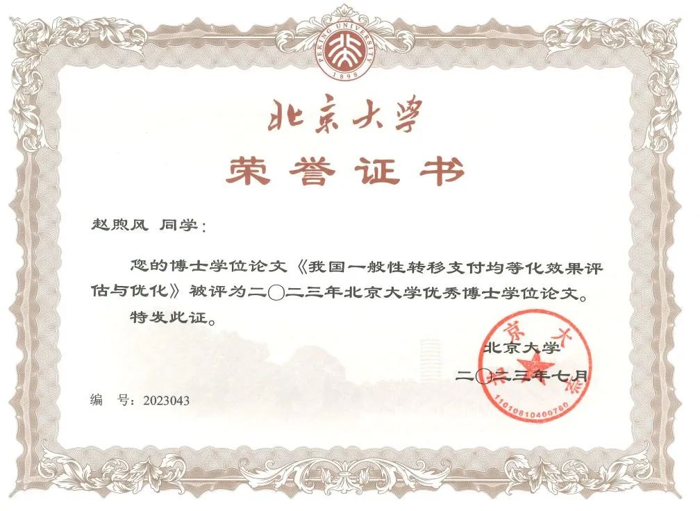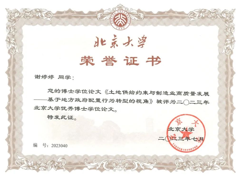 2023年7月5日,英国威廉希尔公司官网公布2023年度英国威廉希尔公司官网优秀博士学位论文获奖情况, 2018级赵煦风的学位论文《我国一般性转移支付均等化效果评估与优化》、2019级谢婷婷的学位论文《土地供给约束与制造业高质量发展——基于地方政府配置行为转型的视角》被评为英国威廉希尔公司官网优秀博士学位论文。
