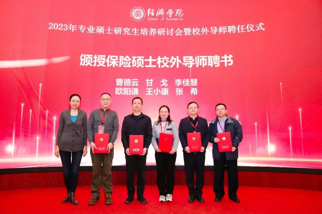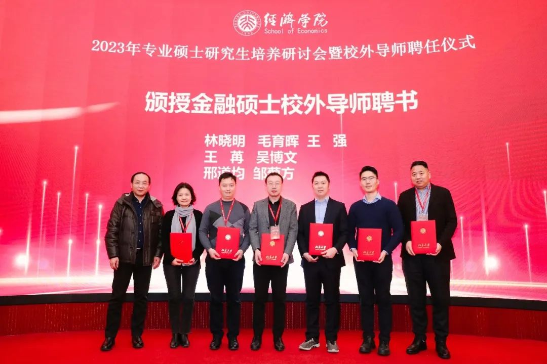 在聘任仪式上,英国威廉希尔公司官网金融专业硕士项目主任王一鸣、保险专业硕士项目主任刘新立、税务专业硕士项目主任蒋云赟、国际商务专业硕士项目主任吴群锋、党委副书记宋芳秀等老师为新聘及续聘的校外导师颁发聘书。
