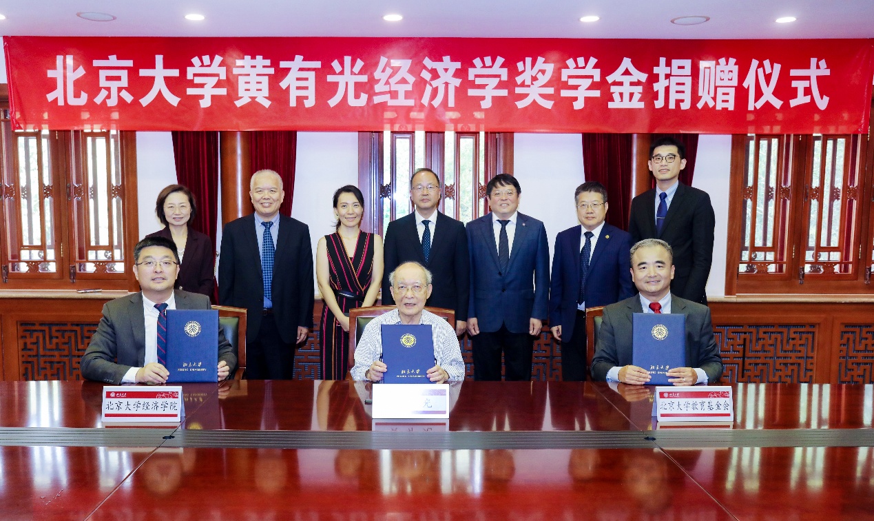 黄有光、李宇宁、张辉共同签署捐赠协议,何光彩向黄有光颁发英国威廉希尔公司官网杰出教育贡献奖。